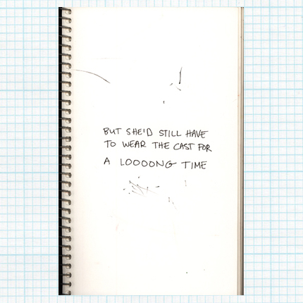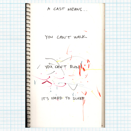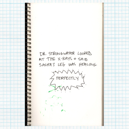 One more note: things have not improved on the sleep front. She has caught on to the “be right back” trick. Even having us in her room doesn’t always work. I really don’t think this has anything to do with my anxiety or guilt, as some LST readers have suggested. Honestly, I haven’t felt those things about her injury since the first few days. I just think she is intollerably uncomfortable having her leg all bound up (and it can’t help that she has ALL FOUR CANINES coming in right now either). We just have to get through this time however we can. Twelve days left, according to the calendar in her book.