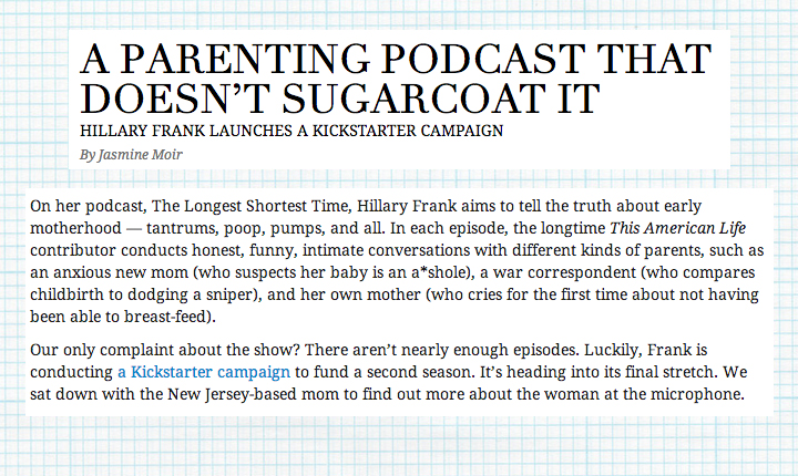 A very pregnant Jasmine Moir of DailyCandy Kids interviews me about our nonjudgy tone, and what we plan to do with Season 2. Excerpt below. For the full interview, click here.