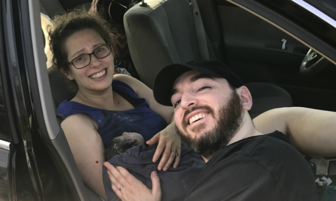 Bethany and Seth Mandel in their Nissan Altima. She wrote about their birth story here for The Federalist, and he wrote about it for The New York Post.