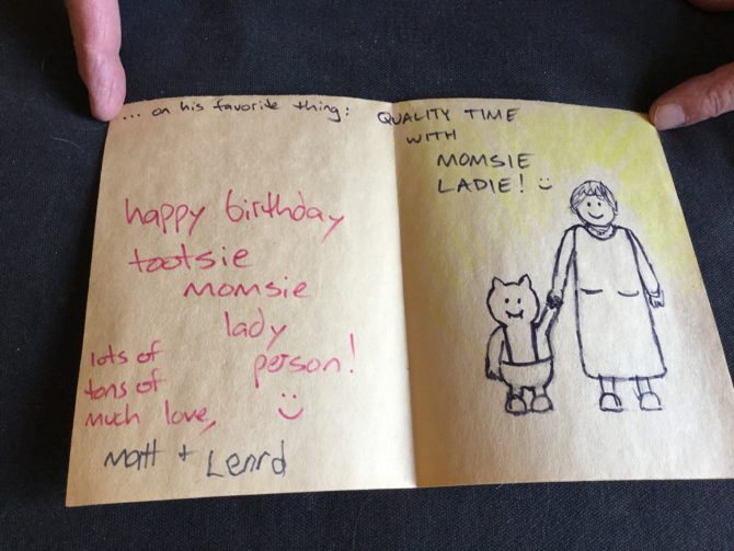 As kids, Matthew and Peter’s world was a menagerie of weird, funny fantasy characters–with layers upon layers of backstory. There were barfing trolls, there were ducks that traveled the world and walked on the bottom of the ocean. There was a critter named Lenrd, who was a championship-level downhill skier and spoke with a French-Caribbean accent. Matthew saved that birthday card above, which he and Lenrd made for his mom.