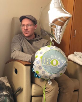 Biff at the hospital with a surprise for Trystan after his top surgery. Photo credit: Trystan Reese.