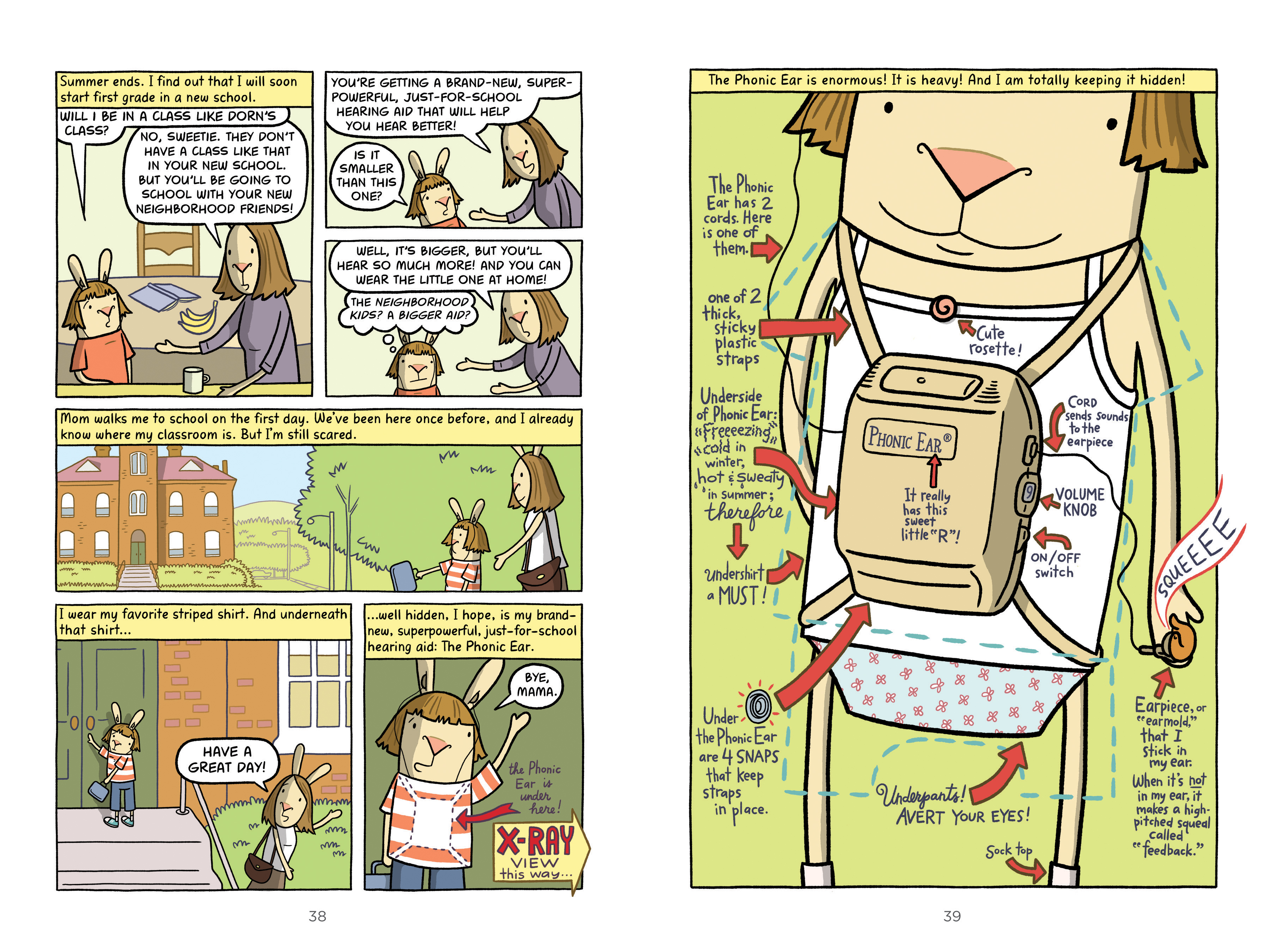 Before Cece Bell turned five, she got really sick and lost her hearing. She suddenly had to learn how to navigate the world of school, friendships, and family, through her hearing aids and lipreading. That’s her on the left as a kid, with her powerful hearing aid, the Phonic Ear, tucked into her overalls.