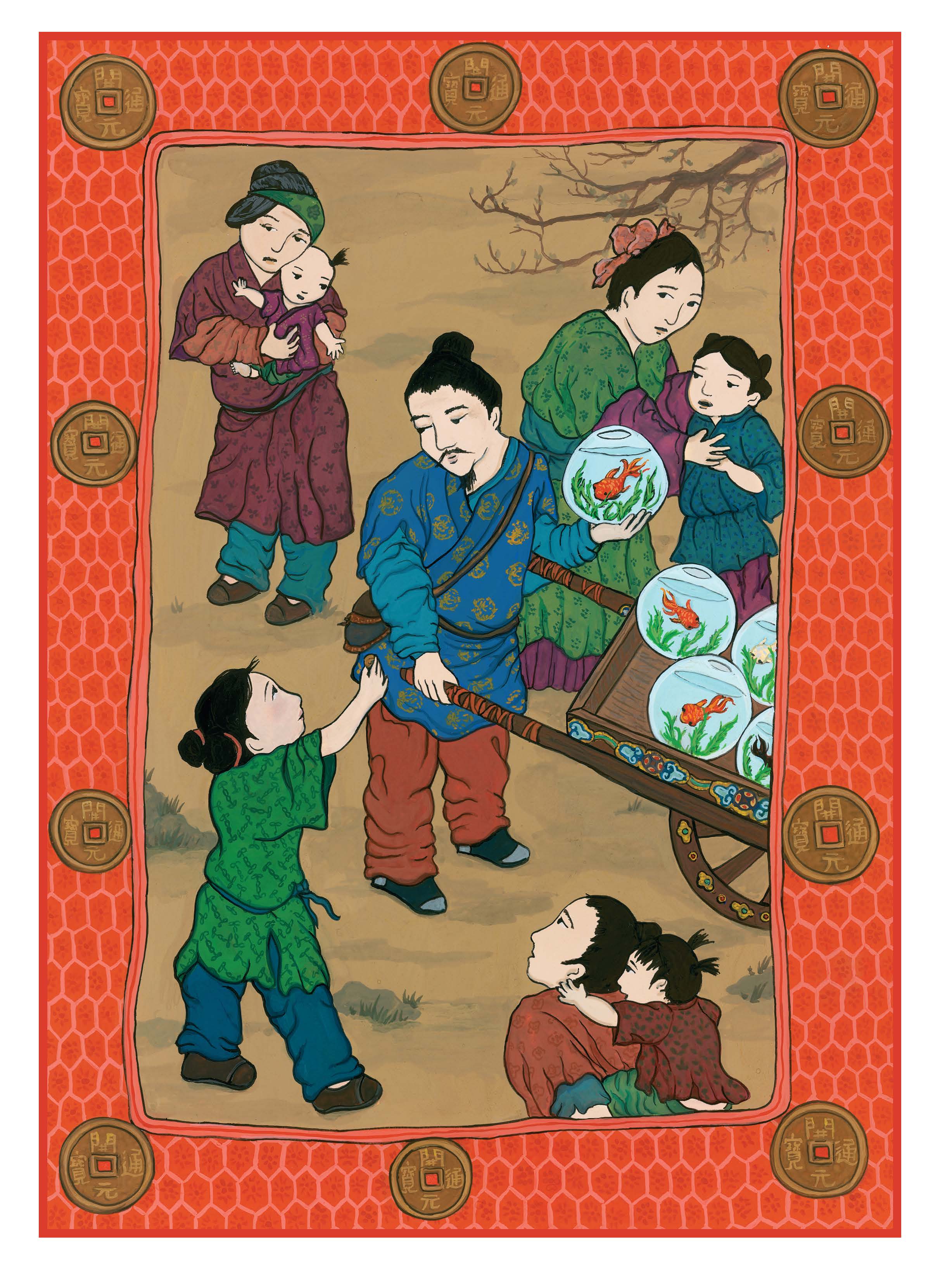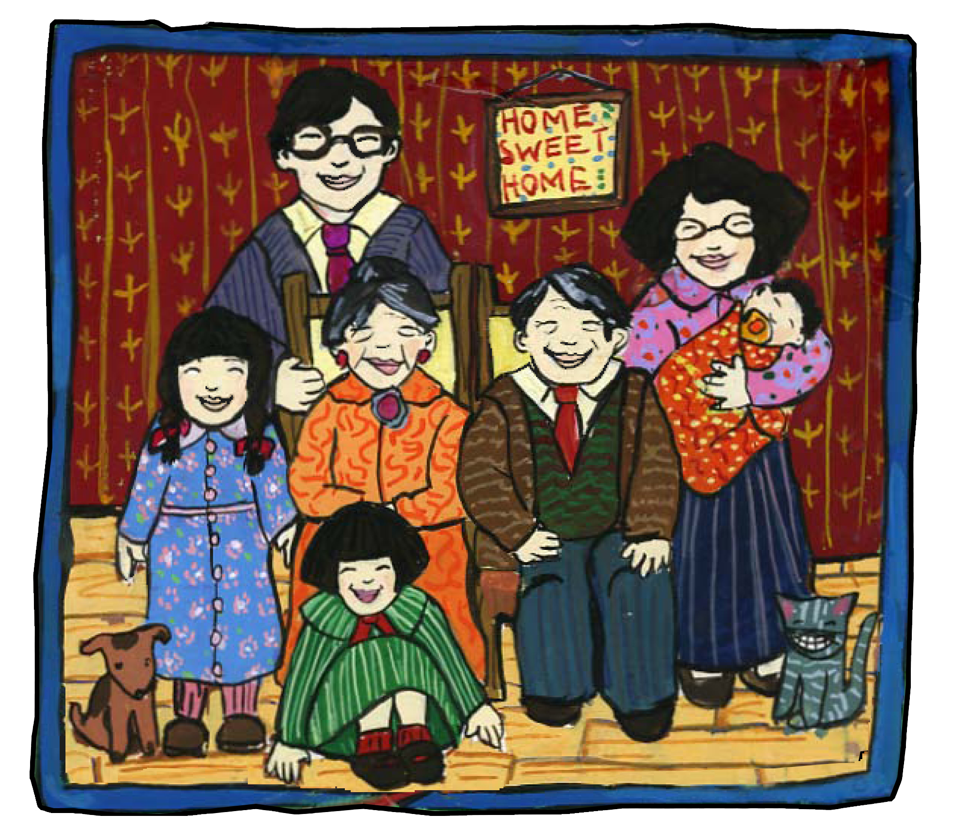 Grace was especially drawn to flat, colorful Chinese folk art, like the image detailed above. So she tried painting a portrait of her family in that style.