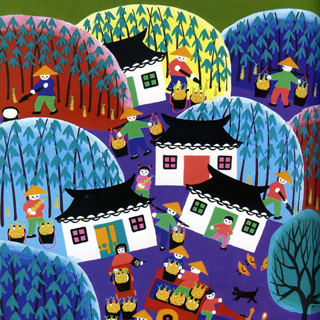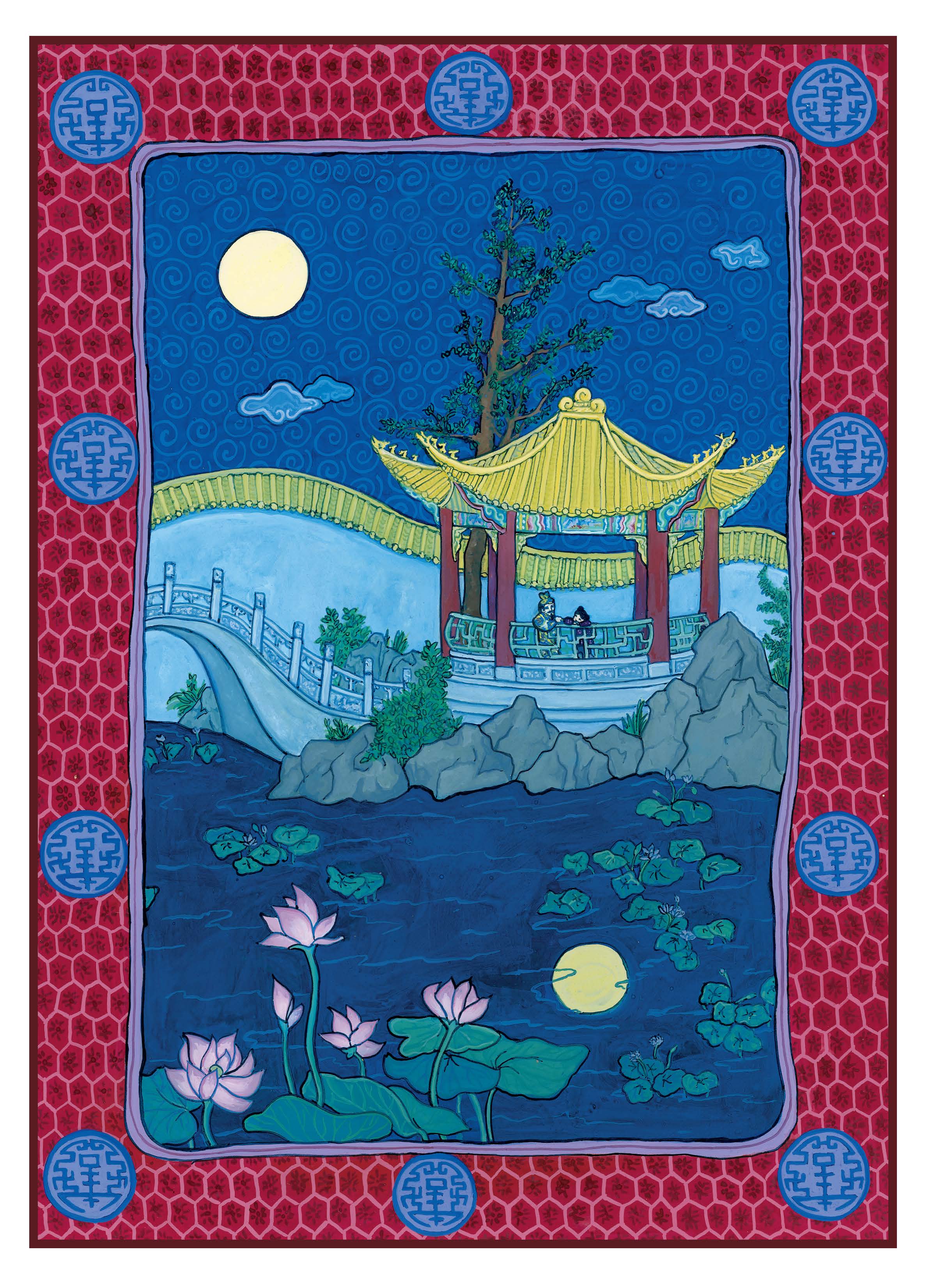 Grace even has Chinese-folk-art-influenced illustrations in her novels, like Starry River of the Sky and When the Sea Turned to Silver. They’re full-color, too—which is unusual for novels, even novels for kids. Here are a couple images from Grace’s Newbery-award-winning book, Where the Mountain Meets the Moon—a Wizard of Oz type saga.