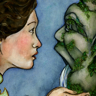 But while Grace was in Rome, she wound up having a conversation with an inquisitive Italian that led her to question who she was and where she came from. And she started making paintings of an Asian girl looking for … something. Here are details of two of those paintings.