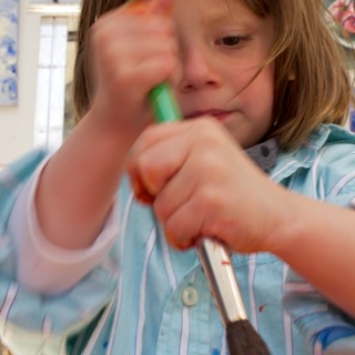 Tell your toddler you enjoy watching her engage in the process of making art, or that you like the particular colors she’s using. When you make positive comments about her work, be specific, i.e. I love the way the blue paint wanders into the red, not, I really like that. Try to avoid asking, What is it? At this stage of development, toddlers are not generally able to represent recognizable things. Also, try not to be judgmental about surprising color choices or “weak spots” in your child/s work. Too often, I’ve witnessed unintentionally crushing remarks made by parents upon initially seeing a child’s efforts: You’ll have to fix that spot or What is that supposed to be? It’s far more valuable to ask your child, How did you make it? or Can you tell me about this painting? When you initiate conversation about their work, it demonstrates to children that you value the things they create, and the discussion will exercise their communication skills, too. Often what kids say about their art will not remotely match what it looks like to adults, but that’s fine. If your child is not interested in talking about his art, you can try it again at another time. Keep in mind, for your toddler, it was all about making the art, and the resulting image is simply a byproduct (however beautiful or muddy) of their experimentation and play. —LF